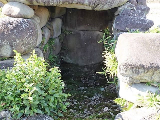 全長約6m、埋葬部長さ約2.5m、幅約1m。安山岩を用いた乱石積の袖無型横穴式石室。