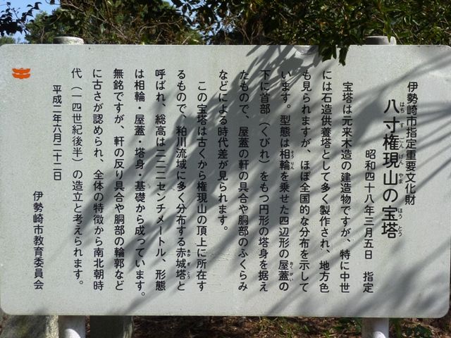 山頂には宝塔があり、室町時代(南北朝のころ)の造立と推定されている。昔は山頂に熊野権現が祀られており、熊野信仰の霊場となっていたらしい。そのためここを権現山と呼ぶようになった。