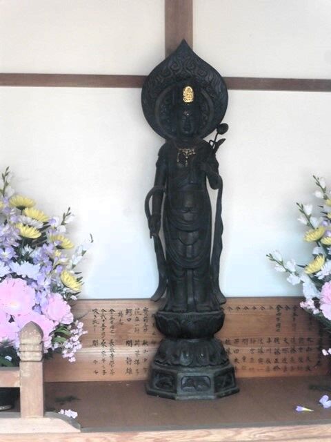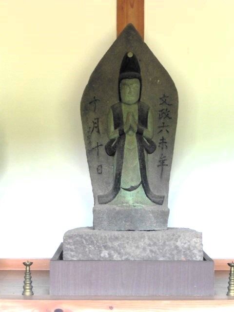 一石観音三尊像。中央に主尊の観音菩薩立像(像高約75cm)、右脇侍に愛染明王(像高約53cm)、左脇侍に不動明王(像高約54cm)を配している。観音三尊自体が珍しい上、愛染明王と不動明王の脇侍の組合わせも極めて珍しいと言える。凝灰岩製で南北朝期の作とされる。